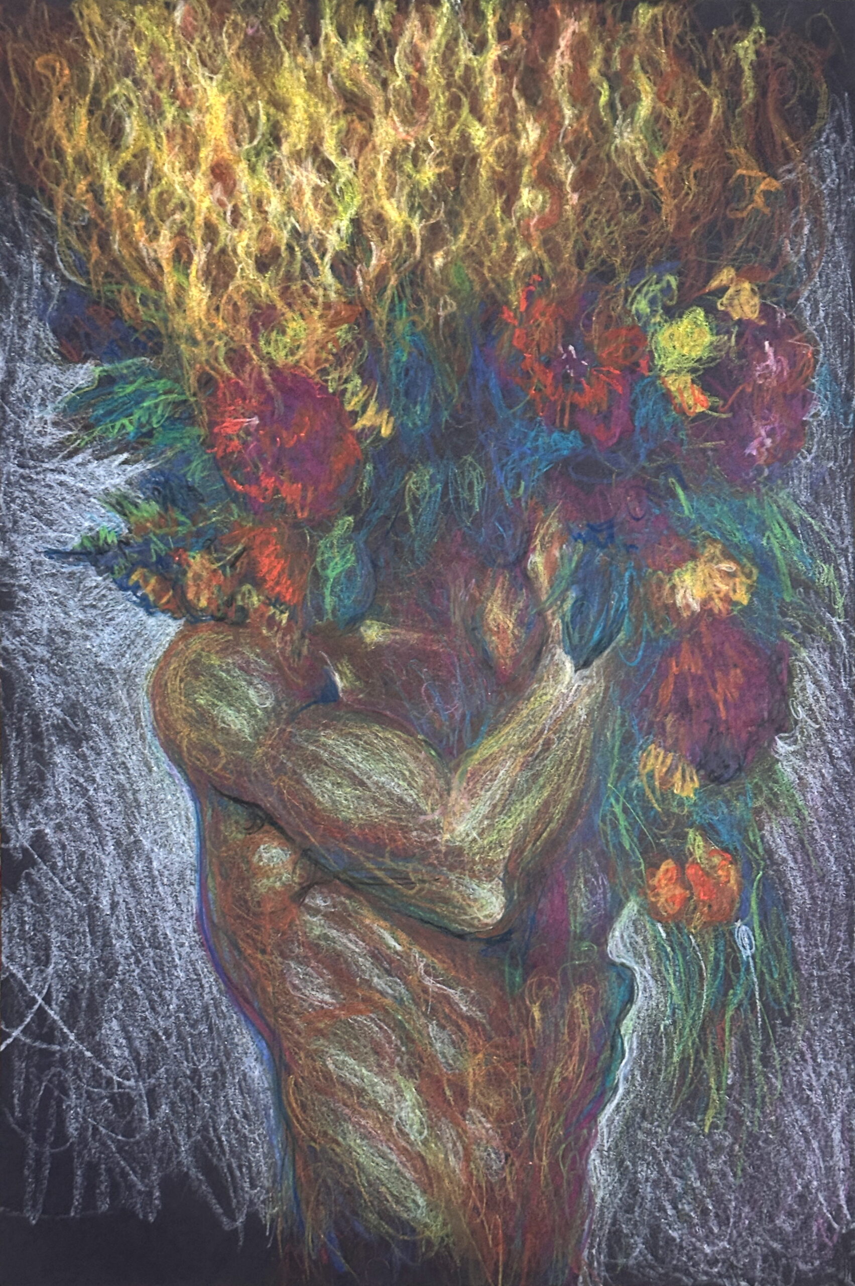 Above the shoulders, the head disappears into a dense, flame-like mass. Yellows and ochres climb upward in looping, smoky strokes, while reds, violets, greens, and electric blues gather around the sides like burning flowers or a storm of petals. The color feels alive and unstable, as if it’s still moving.