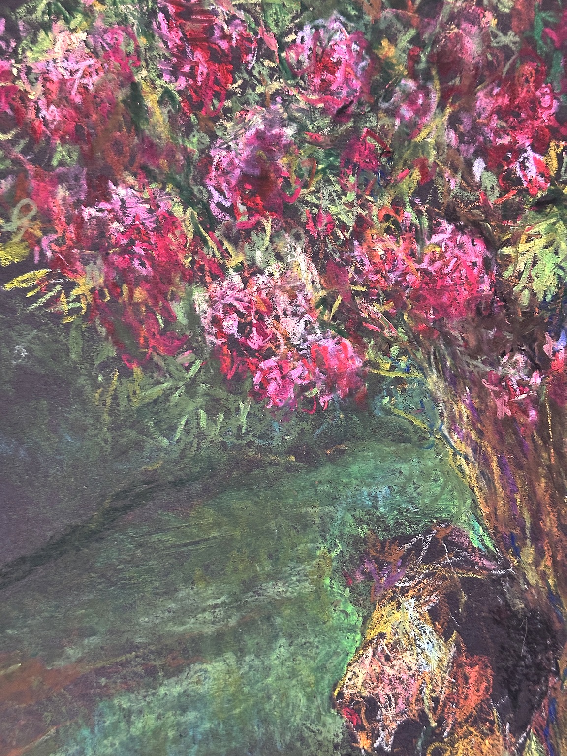 Oil pastel on black paper has strong presence in person—color sits on the surface and shifts as light changes. Frame behind glass, avoid humidity and direct sun.