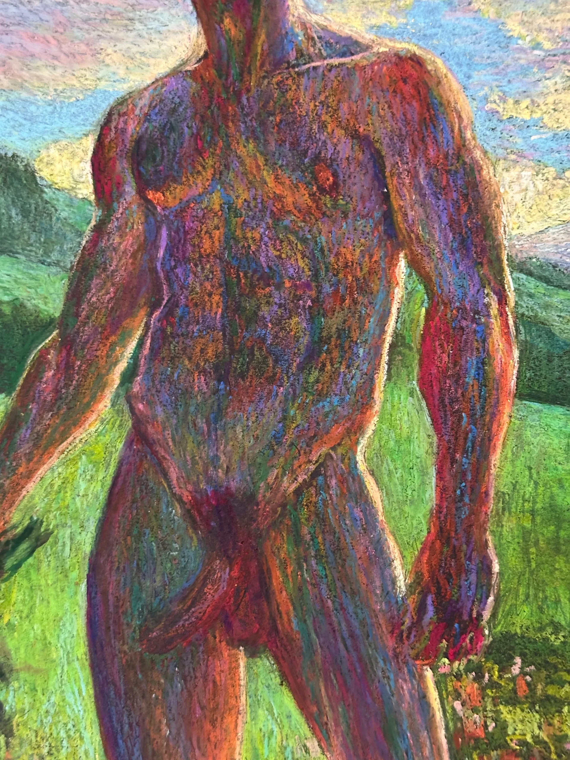 The figure is the anchor. He stands with one arm lowered, holding a bouquet that feels freshly gathered rather than composed. The pose isn’t heroic; it’s slightly inward. The head tilts down, the gaze remains private, and the body feels more observed than displayed. What keeps the work from slipping into simple “romantic nude” territory is the color handling. Skin is built from stacked tones—blues, greens, purples, reds—so the body becomes part of the environment instead of a clean object placed on top of it. The edges catch warm reds like sunburn or heat, while cooler interior passages suggest shadow and air.