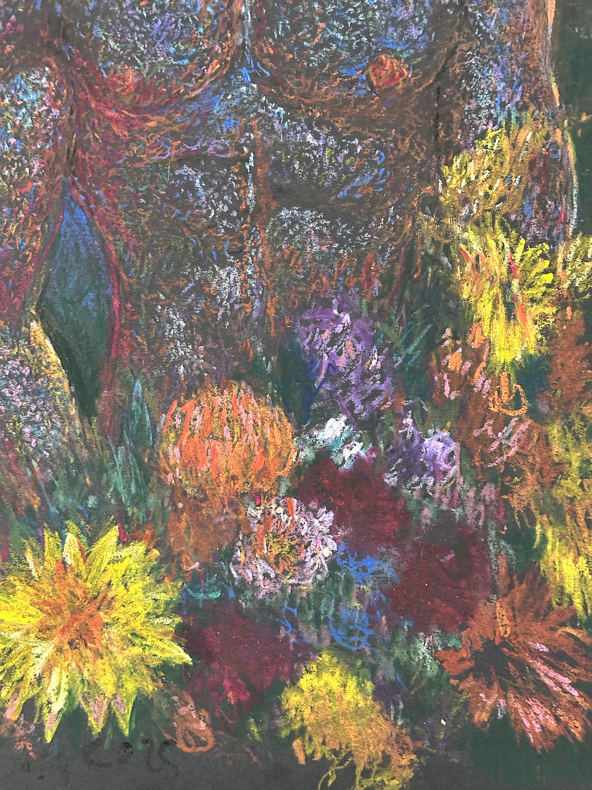 The flowers at the bottom do not sit politely as “decoration.” They surge upward from the dark in yellows, magentas, reds, and purples, with quick, scratchy petals that feel improvised and alive. They function as foreground and as counterweight: their brightness pulls the eye down, then the figure’s gaze pulls it back up. The title, Night Gardener, lands here—not as a story, but as a role. The figure feels like someone who belongs to this hour, tending color where it shouldn’t be able to survive.