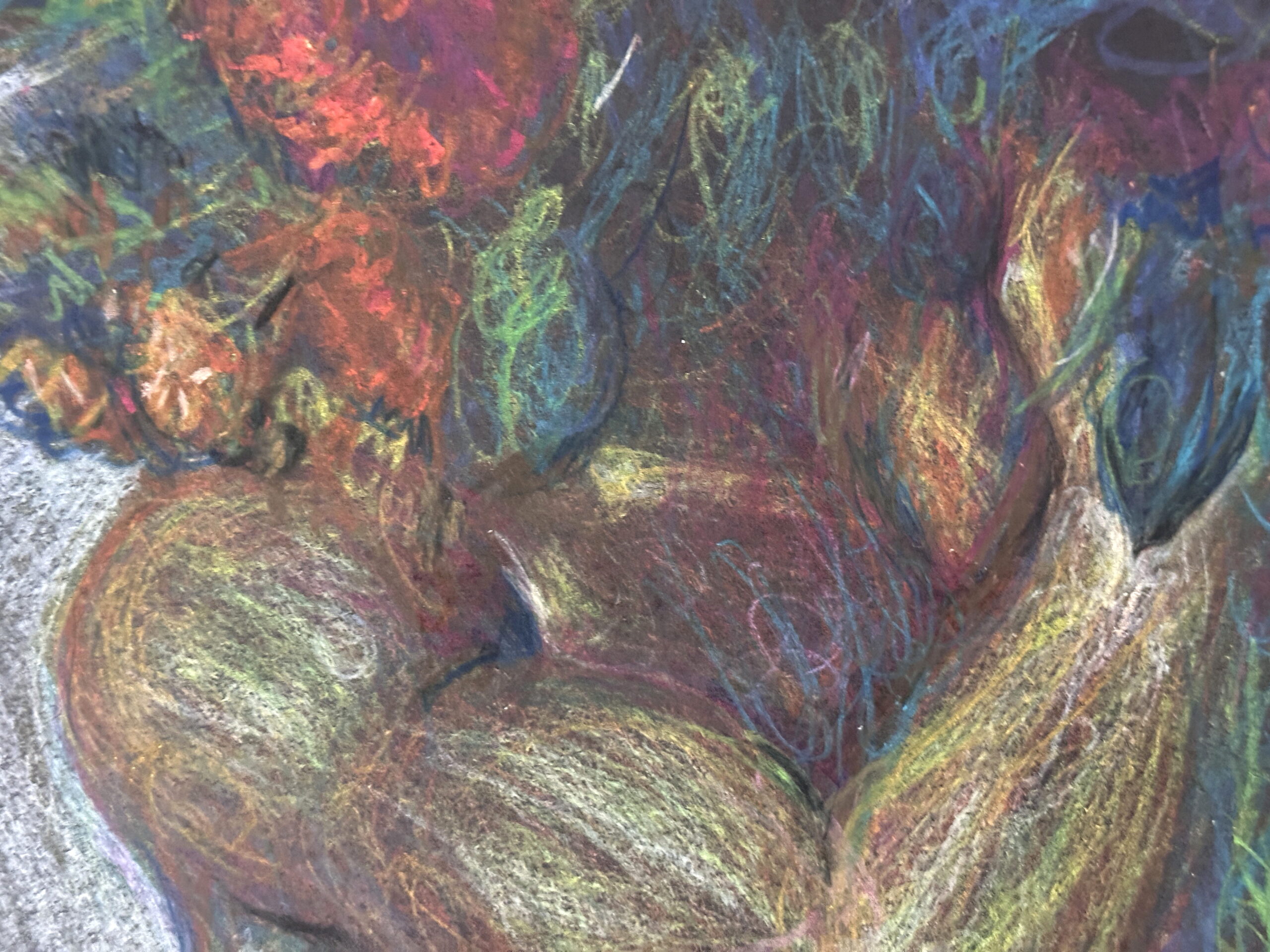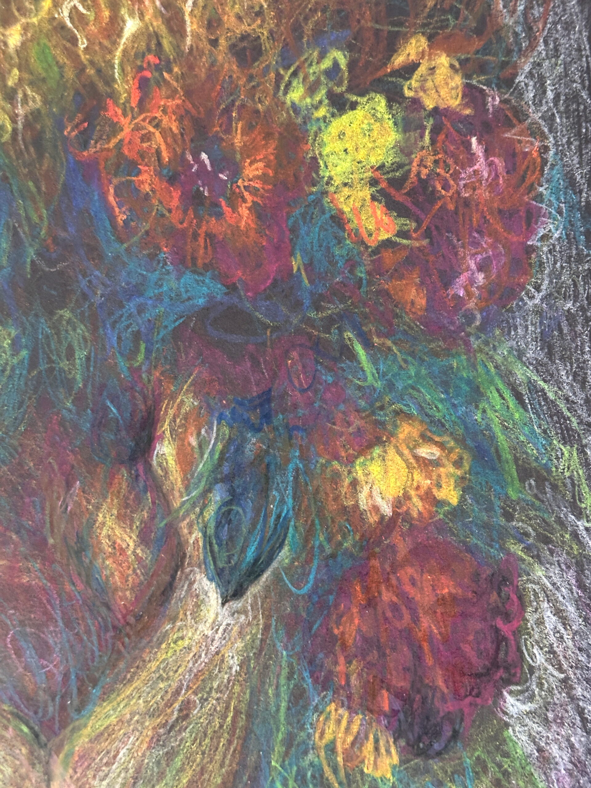 Because oil pastel is tactile and surface-sensitive, this piece benefits from close viewing. In warm light the yellows flare; in cooler light the blues and greens sharpen. Frame behind UV glass, keep out of direct sun, and avoid humidity.