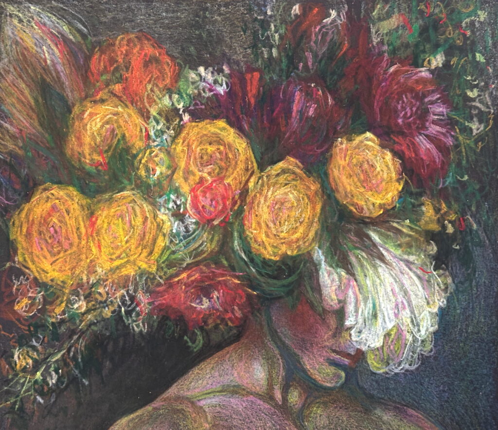In Love With Stopped Time captures a quiet contradiction: a strong, muscular body held in shadow, topped with a wreath that spills color like a festival. The head is hidden by flowers—yellow roses, dark reds, tangled greens—so the piece reads as both portrait and still life. Oil pastel lets the artist work fast and slow at once: quick loops in the bouquet, careful layering across the chest, shoulders, and abdomen.
