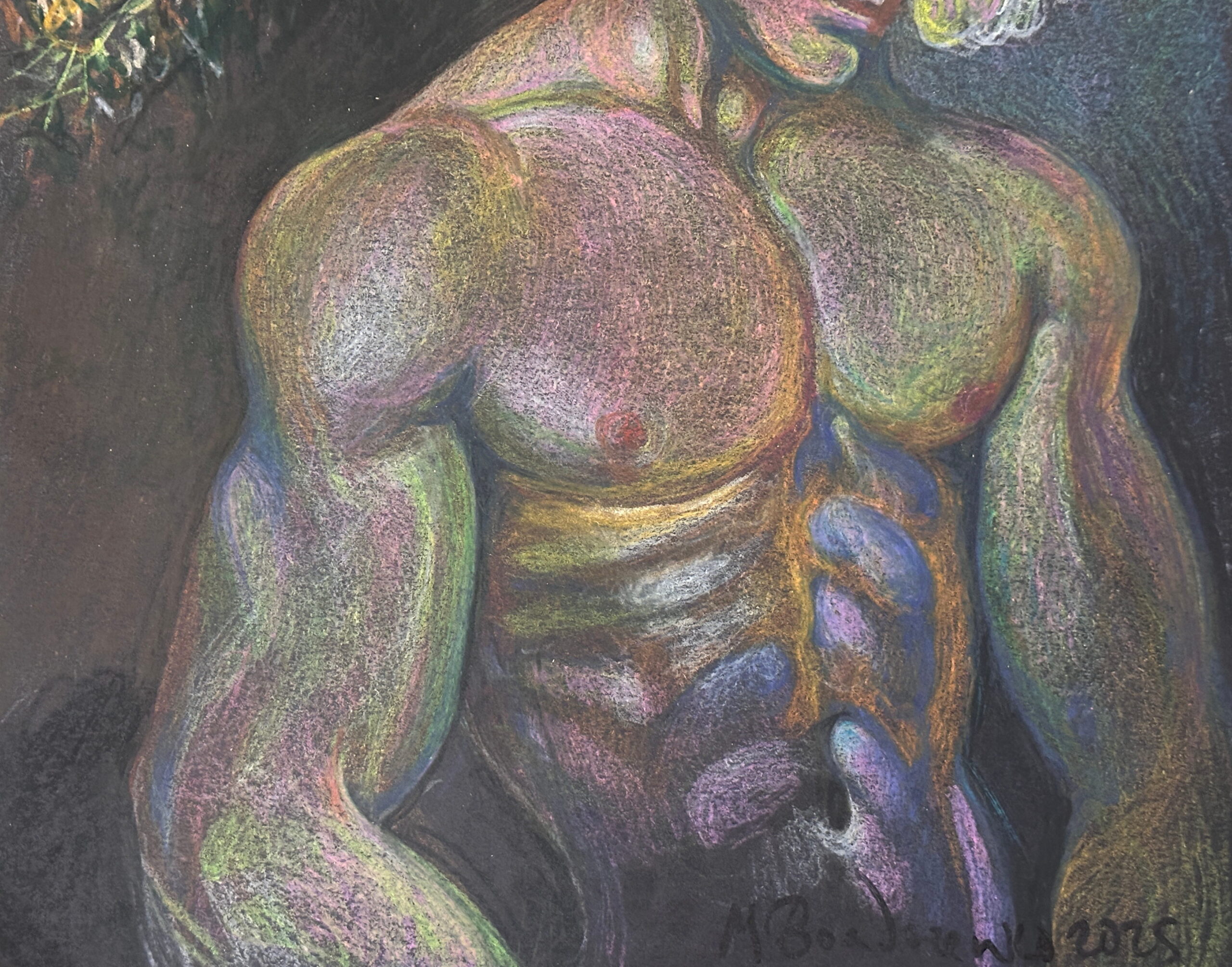 Hang it where you want a pause. It holds attention without shouting, and it rewards close looking: the grain of pigment, the soft edges, the places where color has been pressed into the paper. For a gay artist’s website, the floral “mask” reads as a gentle provocation—desire made visible, but not completely surrendered.