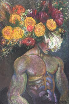 Young Man in Wreath (oil pastel) pairs a grounded male nude with a crown of flowers that refuses to behave. The torso is modeled in layered greens, violets, and warm reds, giving the skin a living, shifting surface. Above it, the wreath bursts outward—yellow roses, deep reds, purples, and quick greens—drawn with energetic marks that feel closer to music than to botany.