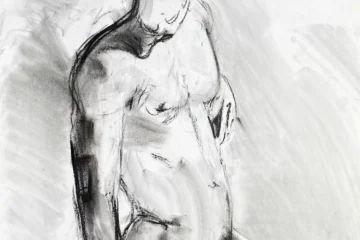 This drawing begins with a refusal: we don’t get the man’s face. Study to “Nightingale” shows the figure from behind, head turned just enough to imply attention, not enough to grant expression. That choice forces the viewer to read the body the way the drawing reads the world—through stance, weight, and direction.