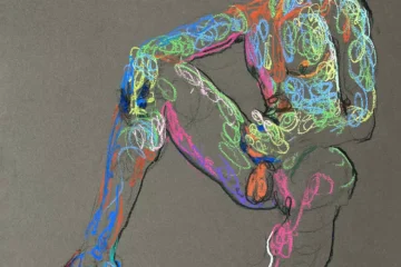Color carries the mood. The man’s back and shoulders are built in warm layers—orange, red, pink, and pale highlights—so the body glows against the ground. The surrounding greens stay varied: some dragged and dusty, some sharp and bright. That push-pull keeps the scene alive: the figure feels present, but never fully “sealed” from the environment.